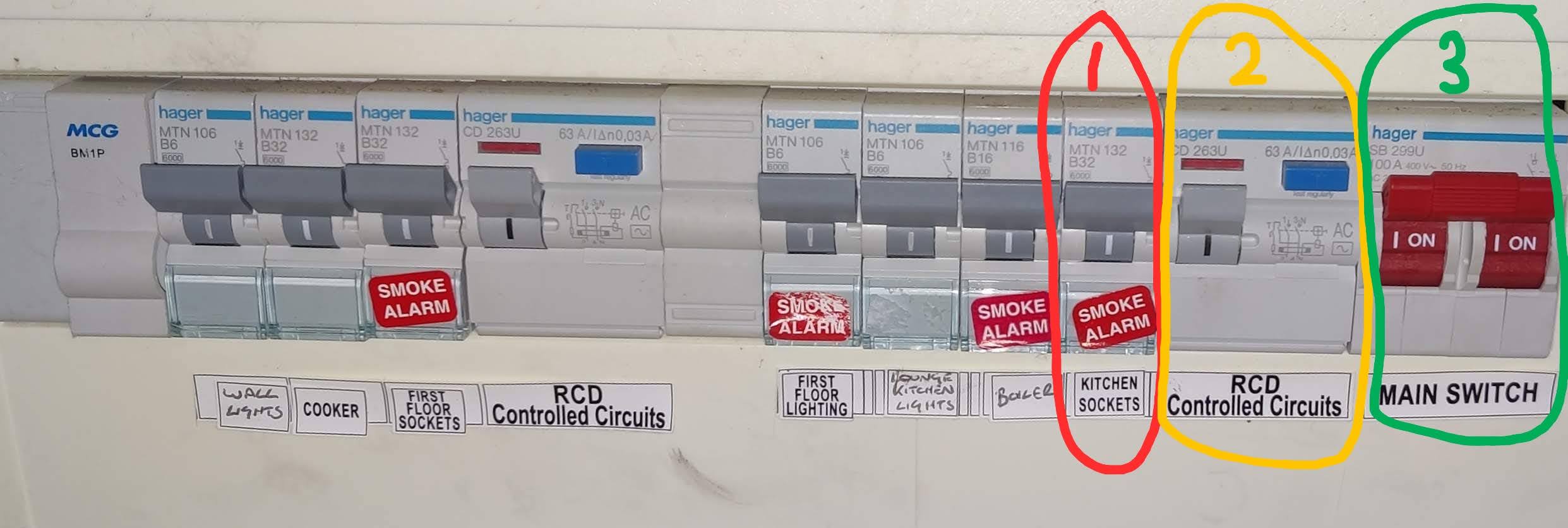 If the kitchen becomes too humid then the RCD protection circuit may cut the power to the kitchen sockets. In the event of power loss to the kitchen please try and reset the switches on the consumer board (located in the front porch) in the order shown in the picture below and stop when power is restored.